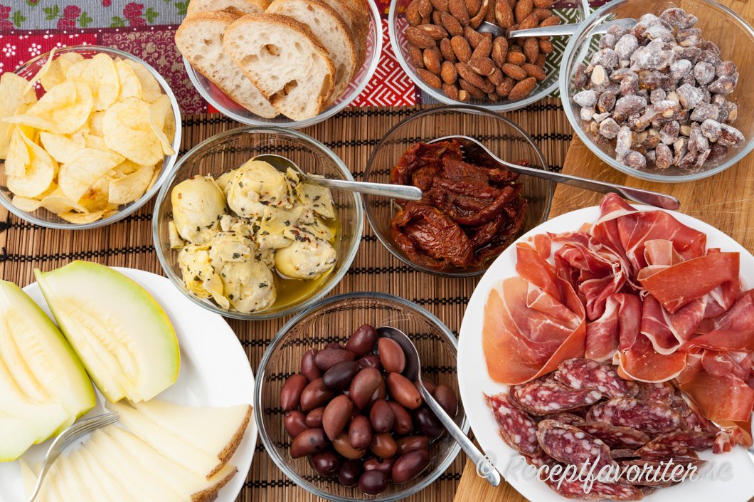 - Förslag är oliver, en bit spansk lagrad hårdost curado typ - manchego, rostade mandlar, valnötter, skivor av charkuterier som korv eller lagrad lufttorkad skinka.