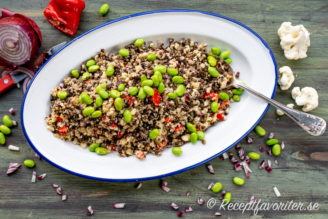Jag gjorde blomkålen lite lyxigare med mer smak av tärnad paprika, svarta Belugalinser, lite rödlök och gröna sojabönor.