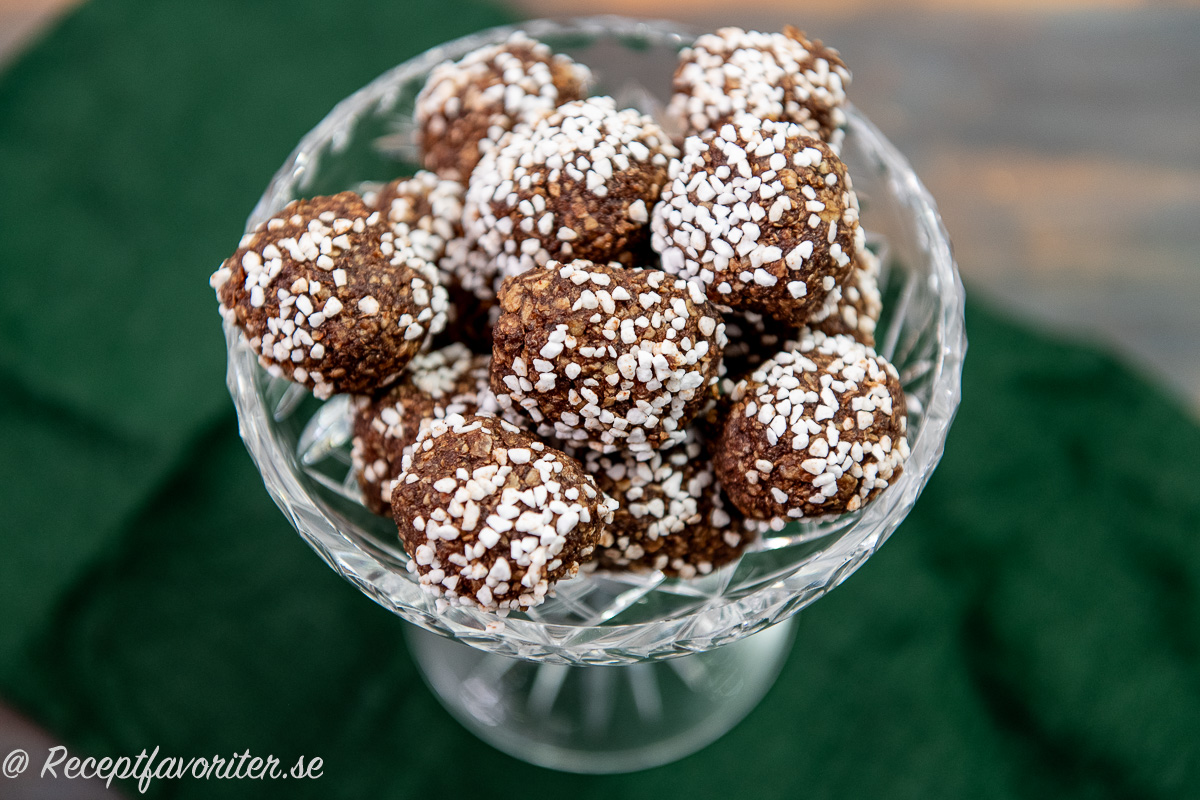 - Chokladbollarna kan även doppas i 2 dl smält choklad - låt de då kallna i kylen först och uteslut pärlsocker.