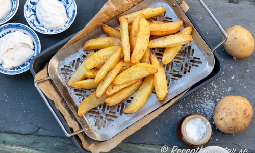 - Värm olja till 180 grader. Använd en fritös. Man kan även fritera i en kastrull med lock. Kontrollera temperaturen med en termometer.