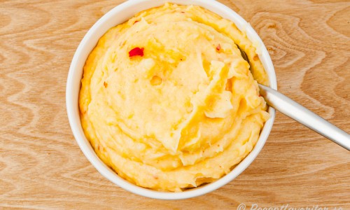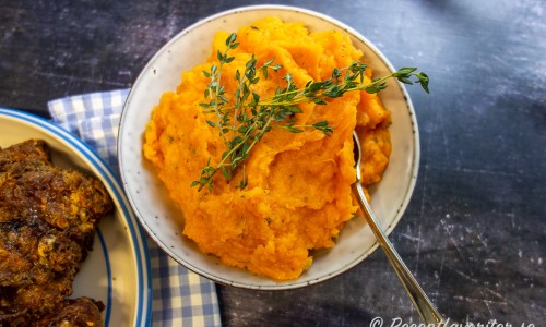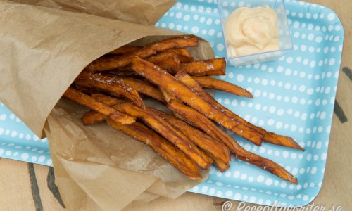 - Vi serverade kycklingen till sötpotatismos, picklad gurka med chili samt chipotlemajonnäs.