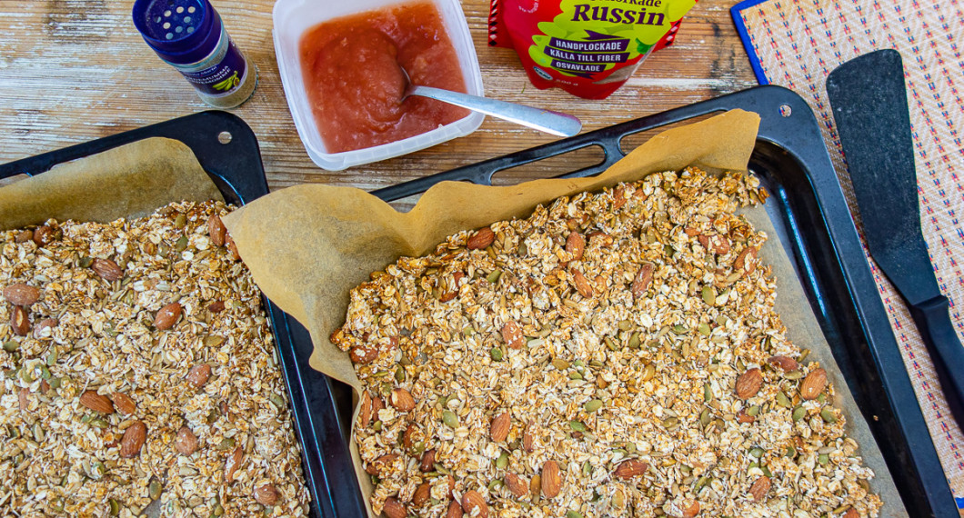 Granola som rostas och får god smak och den rätta smuliga konsistensen med hemgjort äppelmos.
