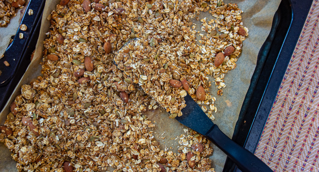 - Rosta granolan i 30-35 minuter. För att granolan ska rostas jämnt så tar du ut och vänder runt den 2-3 gånger samt byter plats på plåtarna i ugnen.