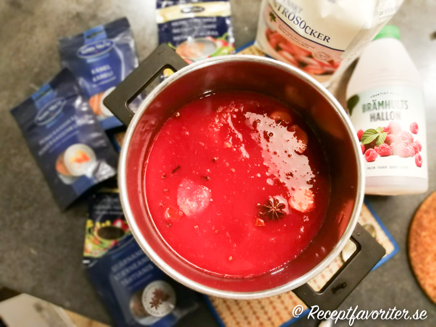 - Värm hallonglöggen och rör då och då. Ta upp och ta bort glöggkryddor om du vill innan servering. Servera varm.