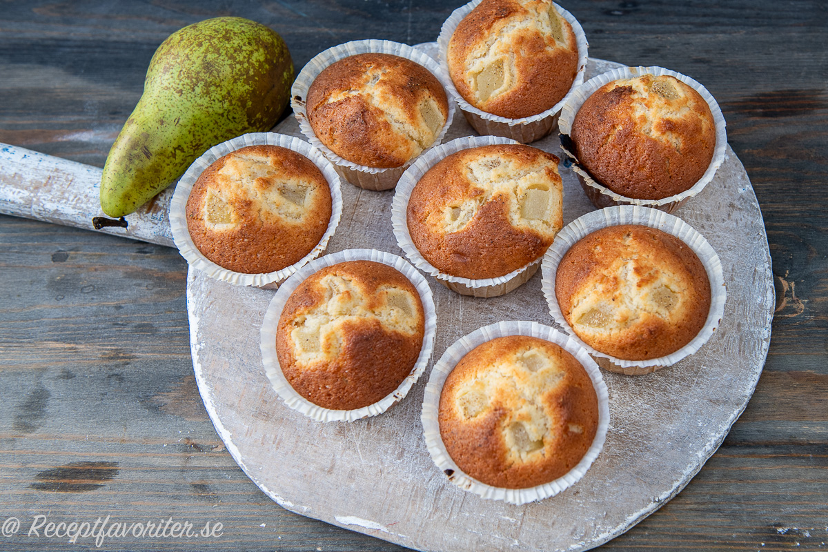 Jättegoda muffins med kryddig kardemumma och saftiga päron som passar utmärkt ihop med smaken av vanilj och smör.