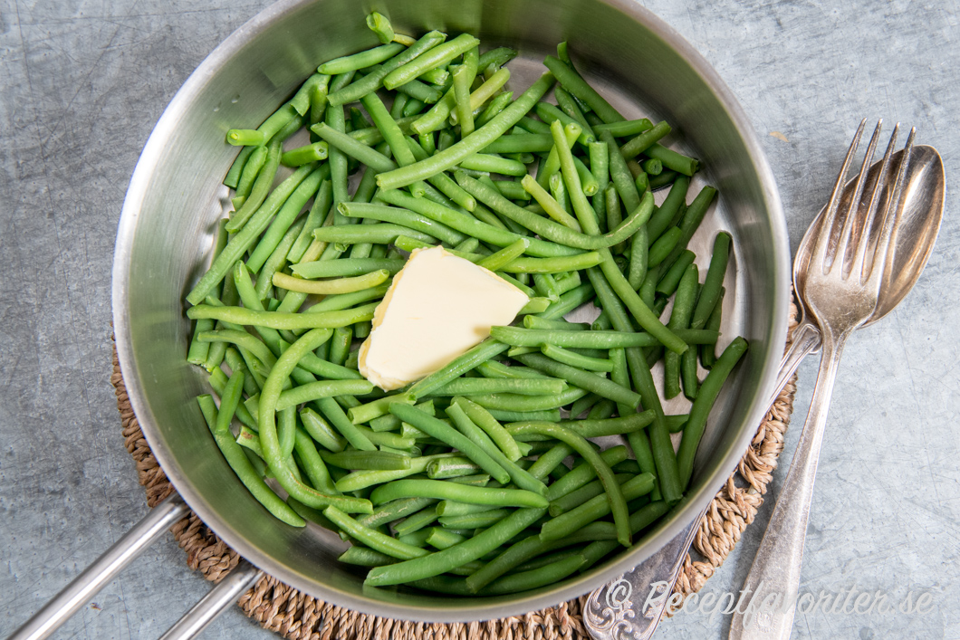 Kokta gröna bönor eller haricots verts är gott med en klick smör (valfritt) och lite salt och peppar. Ett gott, lättlagat, nyttigt och billigt grönsakstillbehör.