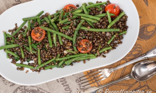 Du kan ta färska gröna bönor, brytbönor, vaxbönor eller fina små haricots verts när det är säsong. Annars funkar frysta bönor utmärkt.