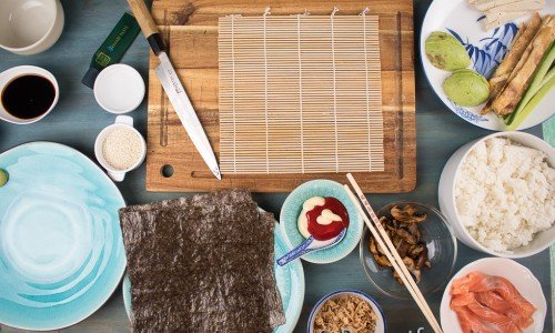 Du behöver en bambumatta (Makisu) och en skål med vatten och gärna lite risvinäger i att doppa fingrarna i så klibbar riset inte så mycket samt att använda som klister till sjögräsrullarna. Och gärna ha plasthandskar eller tvätta händer innan.