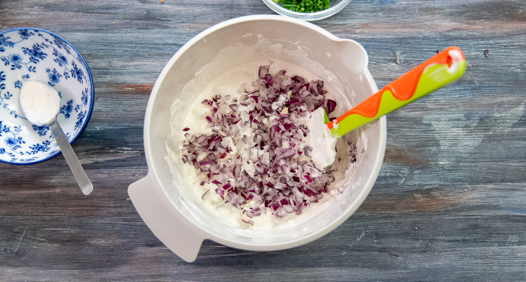 - Tärna kall potatis. Skala och finhacka rödlöken. Skölj och strimla gräslöken.
