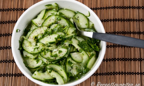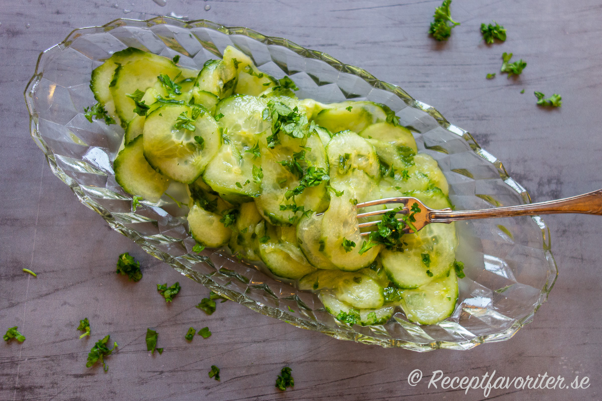 - Vid servering så tar du upp gurkan ur lagen och lägger på fat eller i en skål. Garnera med lite persilja om du önskar det. Eller dill om gurkan är till fisk.
