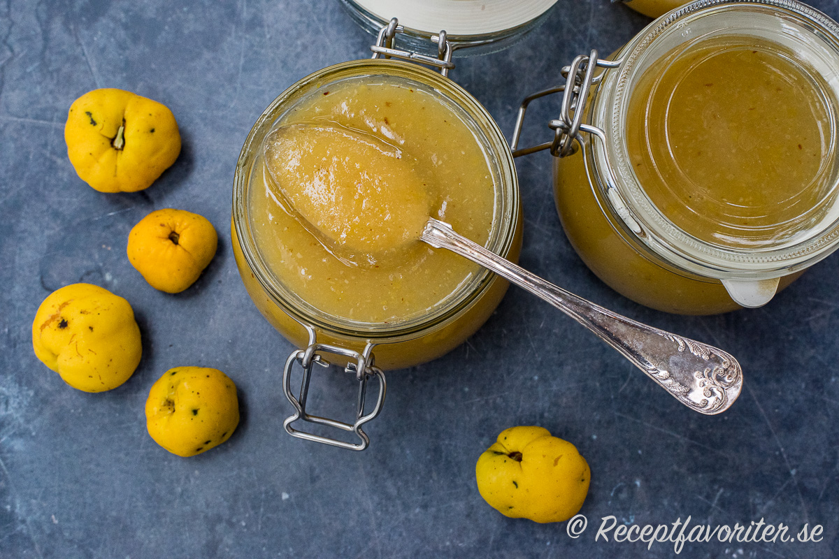 Små fina rosenkvitten blir en god sylt eller mos kokt ihop med strösocker och en gnutta vanilj.