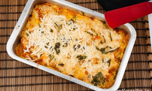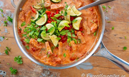 En vegan gryta med sojagrytbitar i tomatsås, lök, vitlök, rosmarin och oregano.
