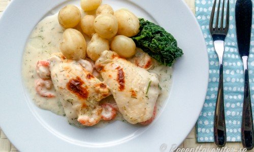 Gratinerade spättafiléer i ugn med vit gratängsås, räkor, dill och ost.