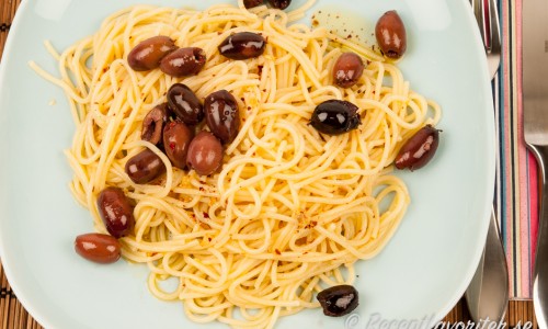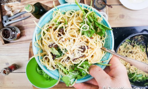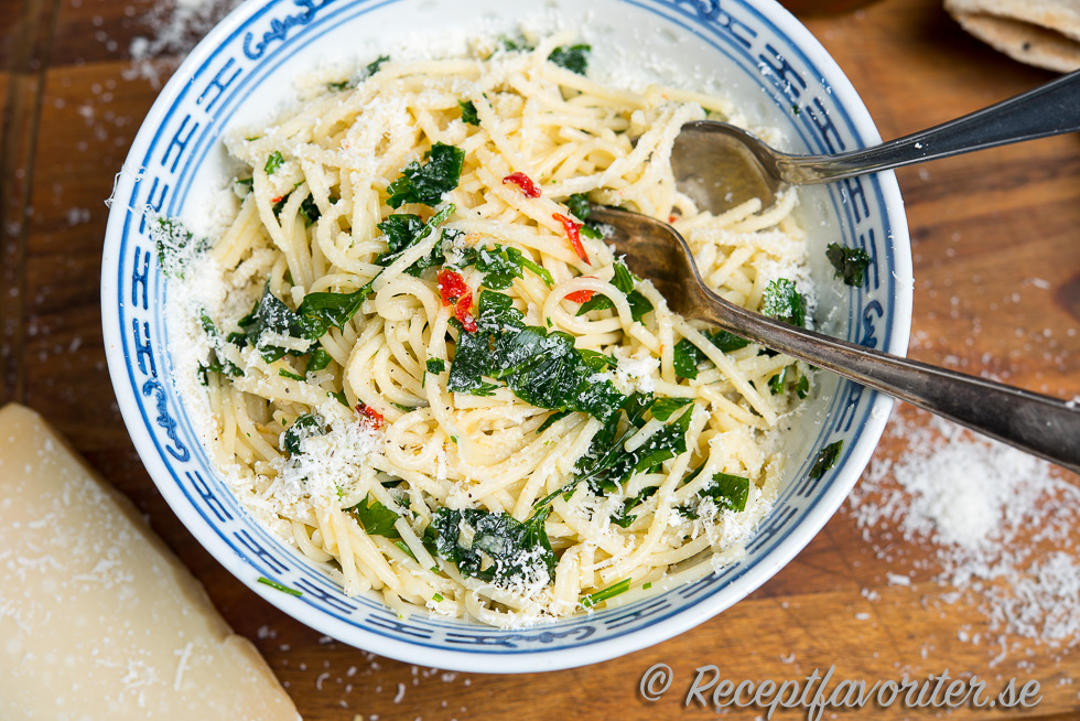 Spagetti med chili, vitlök, persilja, olivolja och parmesan du kan göra riktigt het med stark färsk chili.