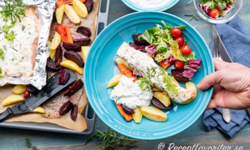 Laxfilé i ugn med glaserade äpplen och rödlök samt rostade rotfrukter av potatis, kålrot och morot serverat med pepparrots-crème fraiche.