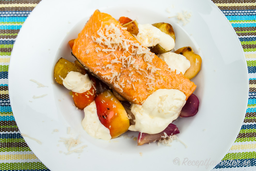 - Servera den ugnsstekta laxen med äpplen och rödlök, rostade rotfrukter samt pepparrotssåsen.