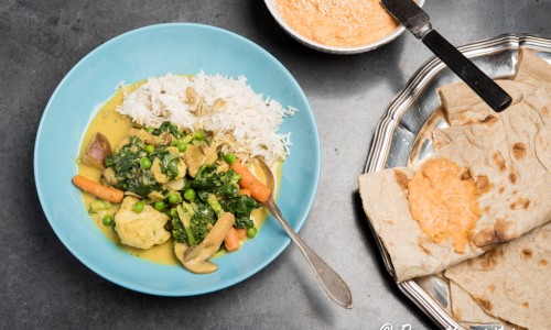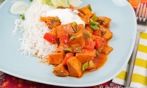 - Några förslag på tillbehör är veganskt potatismos men också råris, kokt potatis, pressad potatis, rostade rotfrukter, bulgur eller tagliatelle passar till.