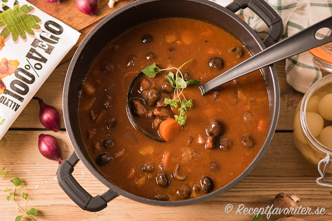 Vegansk gryta eller Bluff Bourguignon. En variant av den klassiska franska köttgrytan Boeuf Bourguignon med vegobitar istället för kött.